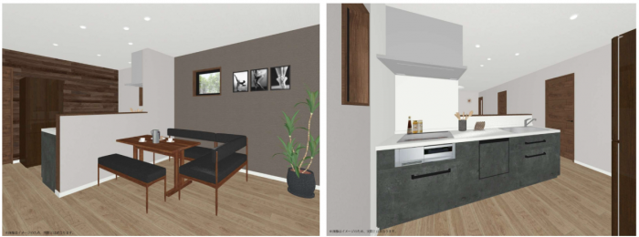 ダークトーンのクロスでシックモダンな印象の内観。キッチンにも落ち着いたグレーを取り入れ、統一感を出しました。玄関ホール直結の和室は、ゲストルームや子ども部屋としてマルチに活用できます。