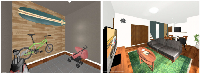 本物件は、アウトドアテイストのウッドデッキやウォールパネルを使ったシューズクロークなど、こだわりの設備を盛り込みました。生活動線に配慮した間取りも見どころです。