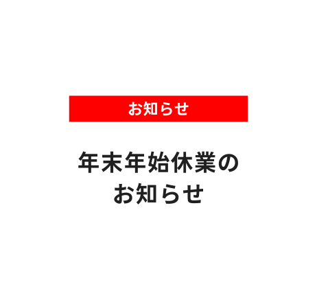 2025年12月05日 | お知らせ 年末年始休業のお知らせ 平素より格別のご高配を賜り、厚く御礼申し上げます。 誠に恐れ入りますが、下記の期間を年末年始休業とさせていただきます。 【休業期間】2025年12月27日(土)~2026年1月4日(日) 【営業開始日】2026年1月5日(月) 休業期間中にお寄せいただいたお問い合わせにつきましては、営業開始日より順次ご回答いたします。 ご不便をおかけいたしますが、何卒ご理解のほどよろしくお願い申し上げます。 Tweet